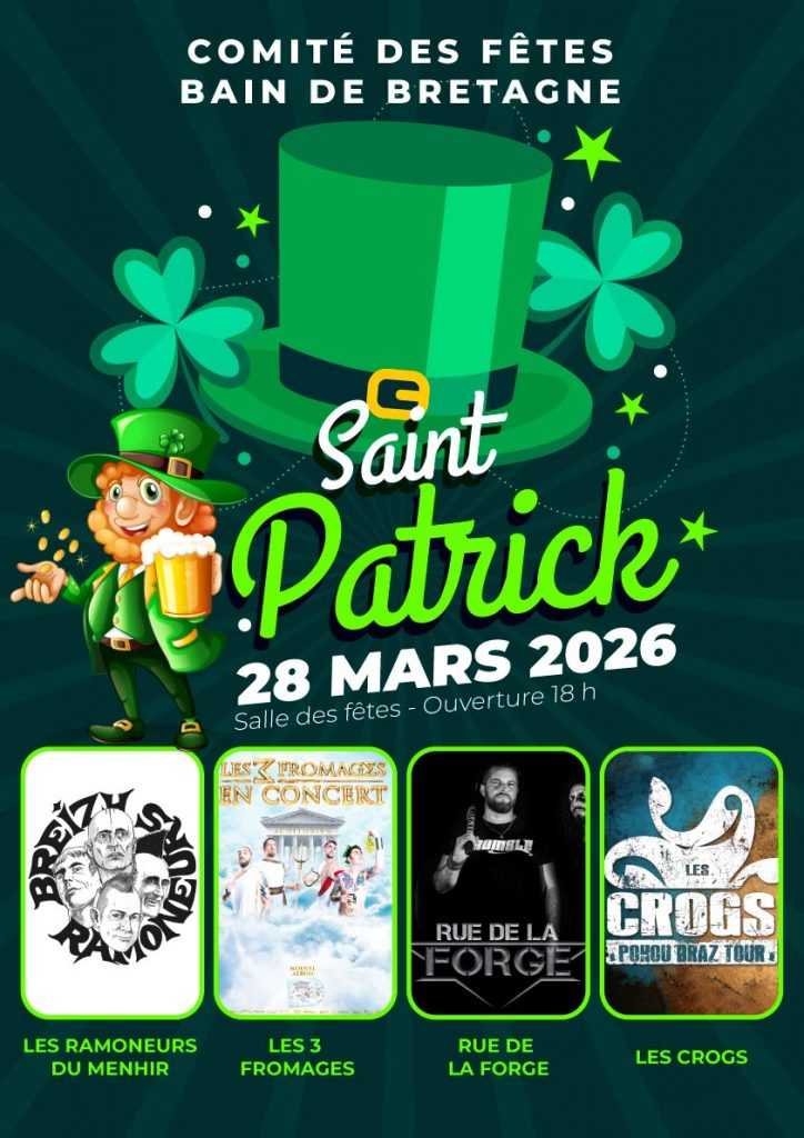 Le Comité des Fêtes de Bain de Bretagne vous invite à les rejoindre afin de célébrer la Saint-Patrick comme il se doit, dans une ambiance festive et chaleureuse !